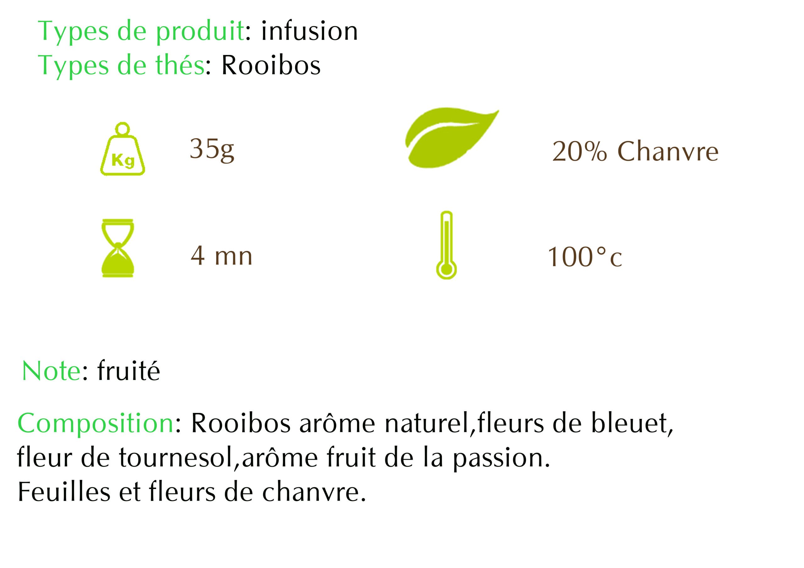 Rooibos profondément exotique, vous retrouvez sans sucre et sans théine tout le piquant sucré du fruit de la passion. Mariage heureux du Cap et de Marie-galante pour des petites pauses gourmandes.
