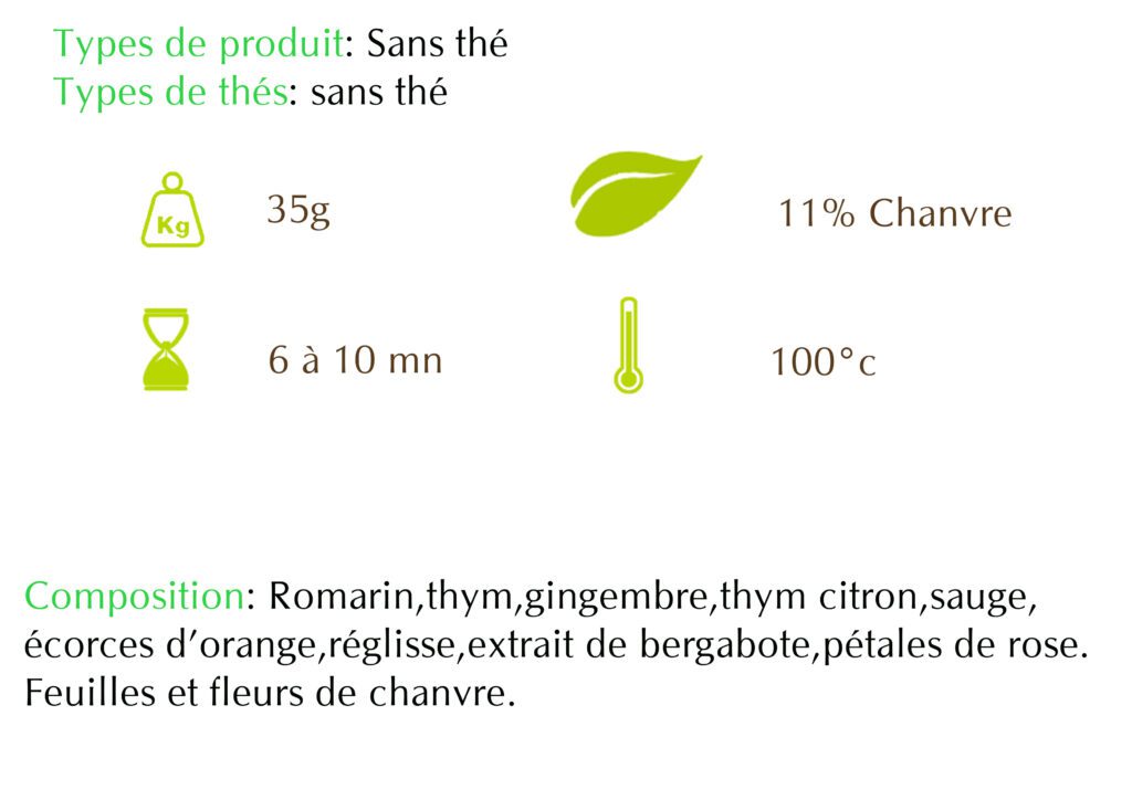 Plongez dans un sommeil paisible avec cette infusion composé à 35% de chanvre. Le chanvre est reconnu pour adoucir les insomnies, relaxer l’esprit et apaiser l’organisme. L’idéal à déguster avant une bonne nuit.